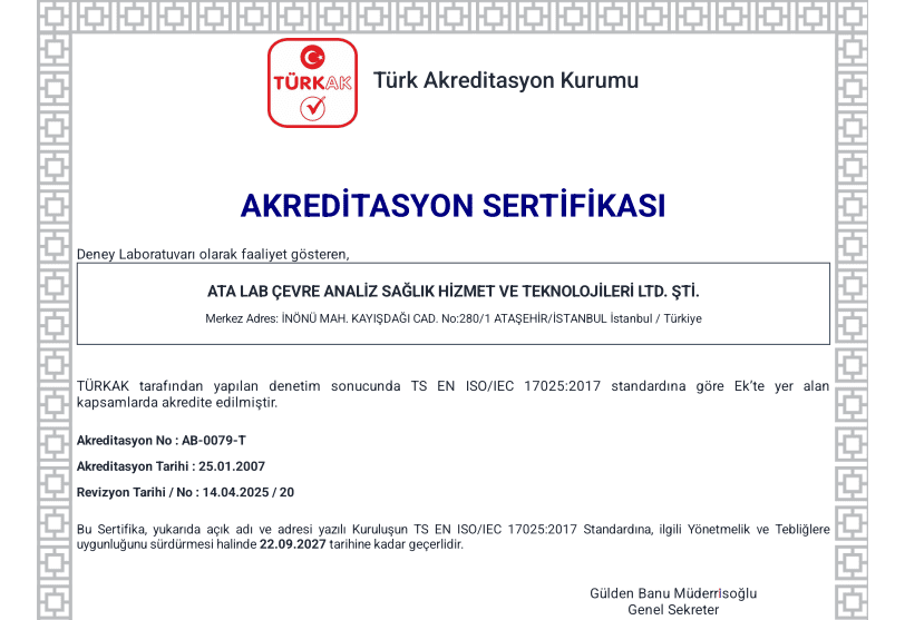 Çevre ve Şehircilik Bakanlığı’ndan Çevre Yeterlilik belgesi almış, Türkak’dan akredite olmuş, sonuçlarının geçerliliği